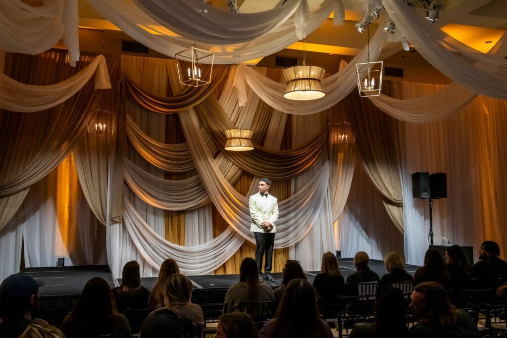The fashion show featured the latest styles from Milk & Honey Bride and Andre’ Julius Custom Suits with all models’ hair and makeup done by Unveiled On-Site Beauty and lighting and runway design by Stage Right Weddings.