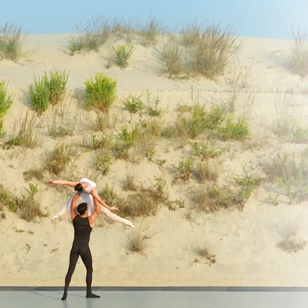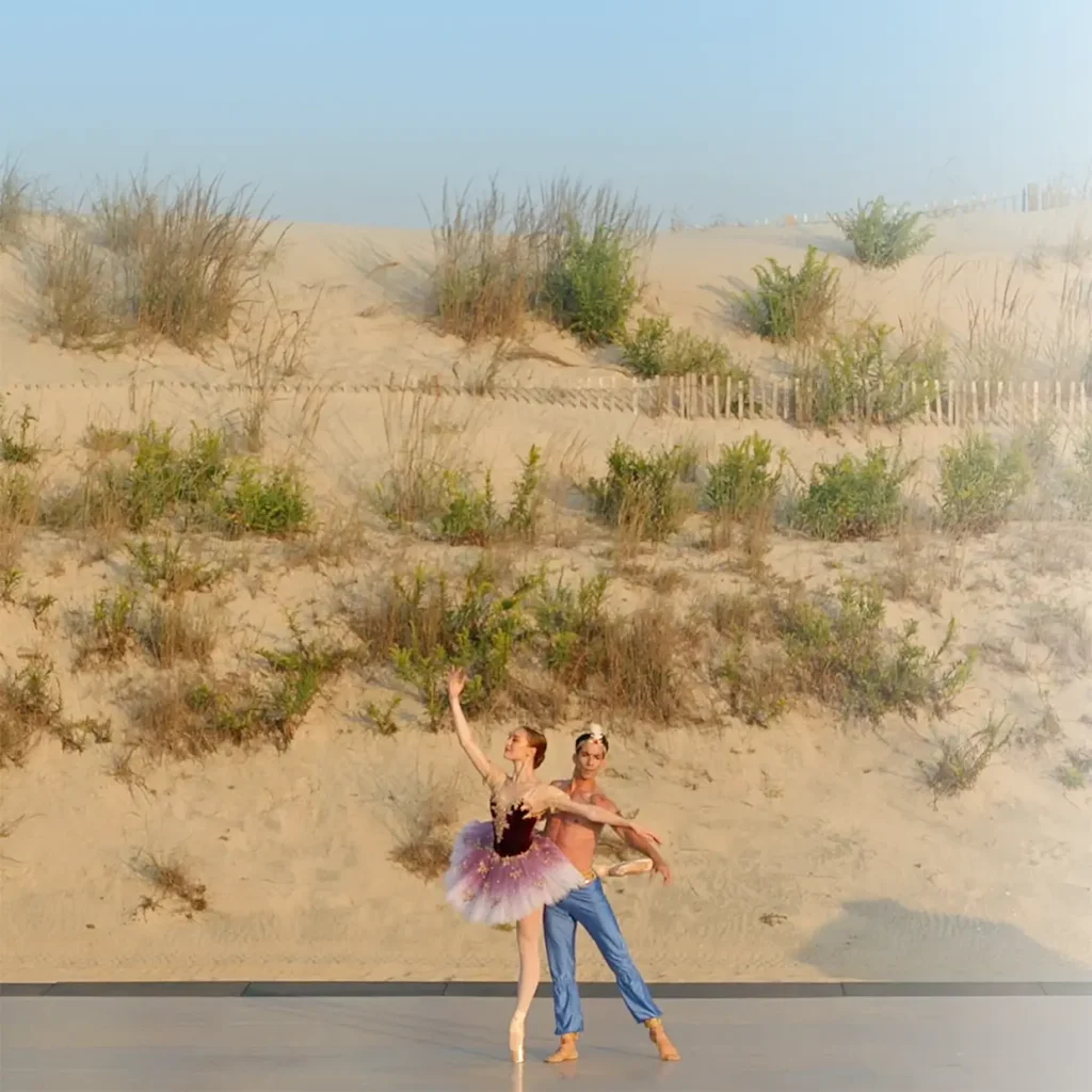 To accommodate the demands of en pointe choreography, the team installs a professional marley floor on the beach itself. But itās the sky, surf, and surrounding dunes that ultimately frame the stage.