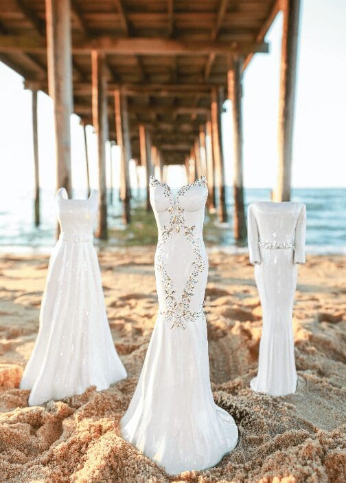 After a little over a year had passed, the phoenix that arose from Erika’s ashes was another powerful symbol: the wedding dress. From both “wet” and “dry” studio spaces in her home—with its calm elegance and light-infused coastal vibe—Erika began making replicas of wedding gowns in clay as she remade her own life. And her fledgling business, StoneWear, took flight.