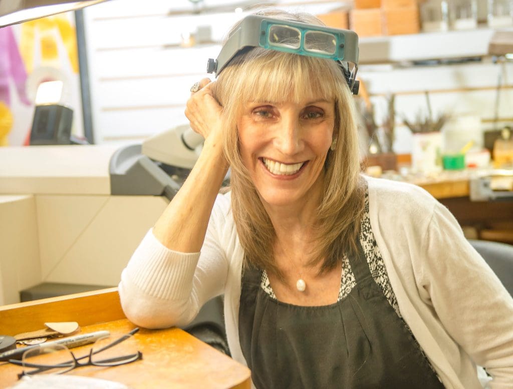 Parsons’ flair for jewelry has continued for decades, working with precious metals and stones while reaching a 40-year milestone at Goldworks. “I still have the passion for making jewelry and I love my clients,” Parsons explains. “Many of them are like family to me.” Though if it wasn’t for her craft, she’d likely be preoccupied by her other passion—her standard poodles that accompany her at the shop every day. Parsons adds, “For right now I’m really happy doing what I’m doing.”