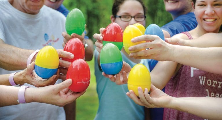 On a warm Saturday afternoon in April, children search for large, plastic eggs in the grass beside the pavilion of...