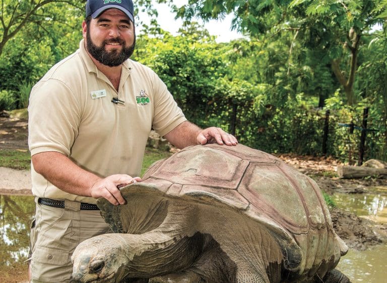 Virginia Zoo's Lead Reptile Keeper Dennis McNamara with AJ, an 85-year-old, 507- pound Aldabra tortoise. Photo by David Uhrin With...